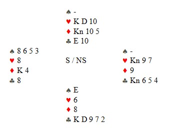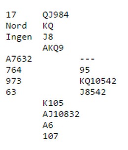 Jeg startet med ruterdamen som "selvsagt" sto. Jeg kunne ikke se enda hvem som hadde dobbel ruter, men jeg visste makker hadde spar esset eller hjerteresset. Skift til spar i tilfelle spillefører måtte gjette den fargen. Knekten vant, men på hjerter fra bordet gikk Ronny Kollnes opp på esset, spilte ruter til mitt ess og ruter til stjeling.
