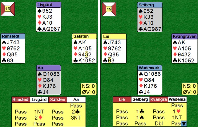 Vi kunne gjerne tenkt oss mer initiativ både fra NBF og kapteinen ift satsing og oppfølging mot nordisk. Vi gjør så godt vi kan på egen hånd, men det er alltid greit med feedback fra andre. Det er visse begrensninger ift økonomi, men det trenger ikke koste all verden. De felles landslagssamlingene på BBO som Tormod har organisert med påfølgende videokonferanse, har vært veldig nyttige. Det er artig å kunne sammenligne egne vurderinger og teknikk opp mot hva de andre landslagsspillerne gjør og tenker. Men det dreier seg bare om rundt 40 spill i de siste ukene før Nordisk. Vi trenger kvantitet i tillegg til kvalitet. Vi må spille mer, og mot god motstand. Vi håper på mer av denne typen trening i fremtiden.