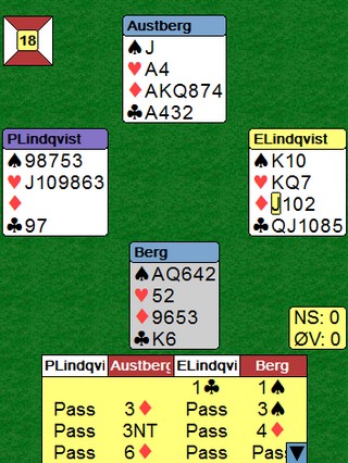 Jeg synes altså at Thor Erik melder steintøft, nesten grisete. 4kl er greit nok, men så kan ikke makker gå på med Blackwood over 4hj. 4sp er "Last train" og viser normalt sparkontroll, men ikke nok kort til å spørre etter ess. Da må da 5kl holde i masse? 6kl står med kongen singel i syd, men her mangla det rett og slett en honnør.