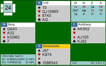 3hj viser bedre kort enn 4hj, og 4kl over 3sp er jeg ikke sikker på. Noen spiller at 3NT i slike posisjoner viser en seriøs sleminvitt i hjerter, mens 4kl bare en cuebid og forteller ingenting om ekstra tillegg, kun kløverkontroll. Ruteren kunne vært skummel for Hoffa, men han kunne nesten ikke legge seg under 6hj nå. En nesten 100% slem som ikke ble meldt ved det andre bordet.