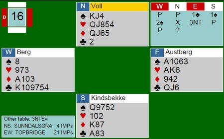 Noen gangen er det nesten umuulig å finne ut hva som står. Da kan det være like greit å hoppe ut slik Kristoffer Hegge gjorde. Kanskje mangles EK i kløver, men det kan være at kontrakten står uten den fargen ut. Da er det ikke noe vits i å sladre, fordi 5kl kan jo også være beit hvis 6 ikke står. Trumfen kan være for dårlig, men 7ru kan også være å slenge i veggen. Grei sats fra Snåsa og innertier når kløverkongen ga det tolvte stikkek med esset foran.