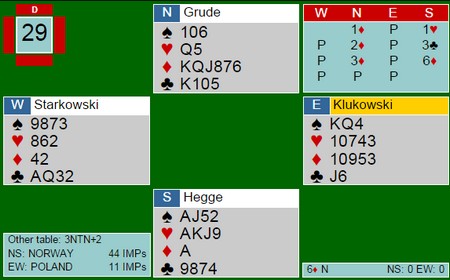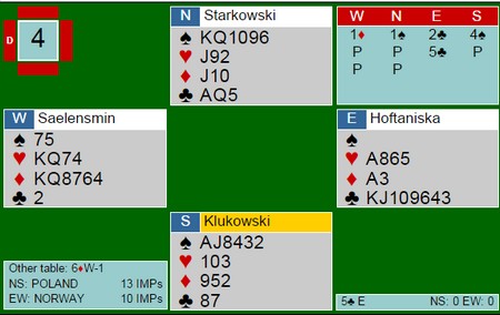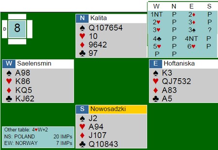 Hva så med slemmene i Polen? Under finner du de fleste av de store spillene og jeg synes det var mye bra. Ikke alle parene som var med er like samspilte, så det får være med i betraktiningen. Jeg er klar over at bridge i etterpåklokskapens lys er en lett øvelse, men det er også et faktum at over tid er de beste spillerne de beste. Også i slemsonen.