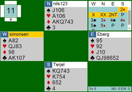 Det er lett å bli etterpåklok når en skal skrive om spill. Dette spillet er kanskje et slikt, men det viser i alle fall at kommunikasjonen mellom Olav Ellestad og Bjørnar Halderaker er på plass. Det kan se litt underlig ut av syd å gå på over 4hj med en minimumsåpning, men poenget er at den er allerede vis med 3hj. Selv da var makker sleminteressert og Bjørnar vurderte sine mellomkort i trumf til å være viktige, det samme med ED i spar og ruterkongen. Det stemte og kontrakten var rett så fin. Det stod i praksis på en av to finesser, og når begge gikk var det tretten stikk. 11 IMP i gevinst mot 4hj +510 på det andre bordet.