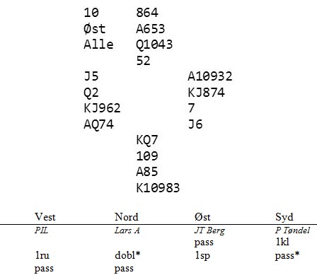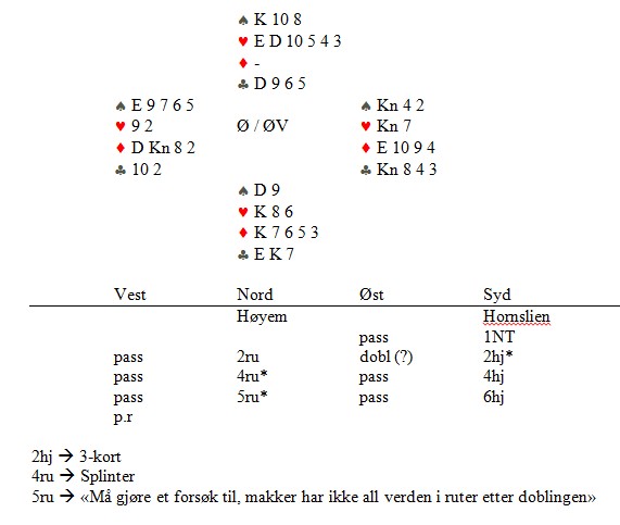 Roar og Asbjørn har helt sikkert forbedret seg på dette nå og melder 4KL på åpningshånden isteden for 3NT. Det doble sparholdet var en distraksjon som Roar ble grepet av.