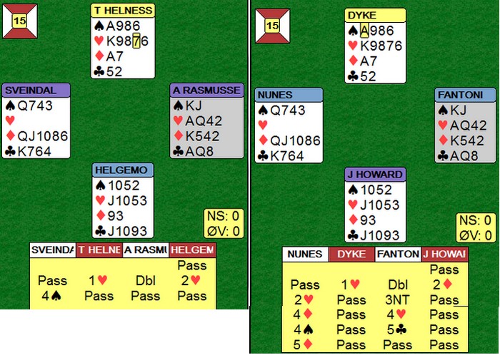 Tor og Geir kommer i en steinhard 3NT, men hadde vest hatt hjerteresset måtte Noralia klart å cashe fire ruterstikk. Nå ble det fire sonebeiter til tross for at EKD i ruter felte knekten. Jon Sveindal fant hjerterskiftet i stikk fire!!