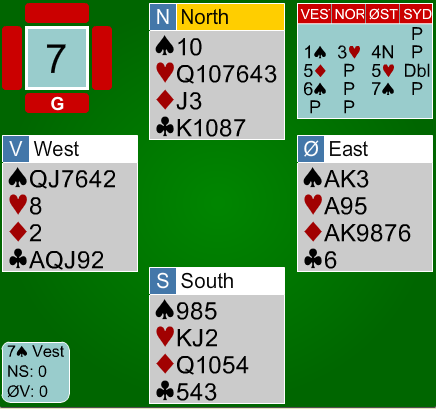 I lagbridge er det de store spillene som avgjør og dette er et sånt et fra kampen mellom GUTS.COM og FULLHOUSE. Norske Pernille Lindaas og Jørn Arild Ringseth sitter ØV og melder seg opp i en absolutt spillbar 7sp. Jeg skjønner godt at Jørn i øst melder storeslemmen og var ikke spesielt heldig med makkers single ruter.