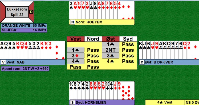 Når en skal ta igjen over 30 IMP på 14 spill, må en håpe på fordelilngshender. Derfor 4ru fra Ole, men det kosta -800. Godt forsøk og ikke verre enn 4 IMP ut mot 4sp hjem på det andre bordet.