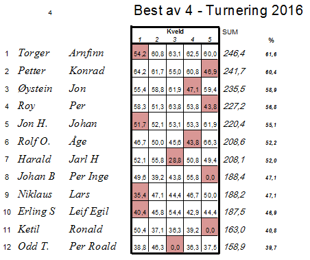 Finn Erik og Lars Håvard/Frank (spilt med Finn Erik 3 omganger hver) økte ledelsen til 39 poeng og Ludvig og Anne må ha utopiske 87 prosentpoeng for å gå forbi under forutsetning av at lederparet ikke forbedrer sitt dårligste resultat på 57,41 poeng fra omgang 1. Det kommer ikke til å skje, så vi tar nok ikke munnen for full når vi gratulerer Finn Erik og Lars Håvard/Frank som årets klubbmestere med sine 376 poeng. Til sammenligning ble André Hansen – Jarle Melby klubbmestere i fjor etter å ha oppnådd 341 prosentpoeng. En poengsum som også blir slått av Ludvig og Anne dersom de oppnår 52 poeng eller bedre i bonusomgangen førstkommende tirsdag.