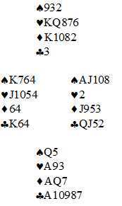 Øst var giver og passet i åpning, før Petter i sør åpnet 1 grand. Etter en overføringssekvens ble han spillefører i 4 hjerter, en god kontrakt som også var standard i salen på dette spillet. Det ser imidlertid vanskelig ut å vinne den med den ekle sitsen i begge rødfargene. Eide fikk spar seks ut til esset, spar knekt til damen og kongen, og en tredje spar til stjeling. Nå fulgte hjerter ess og hjerter ni til kongen, som avdekte hvordan trumfen satt.