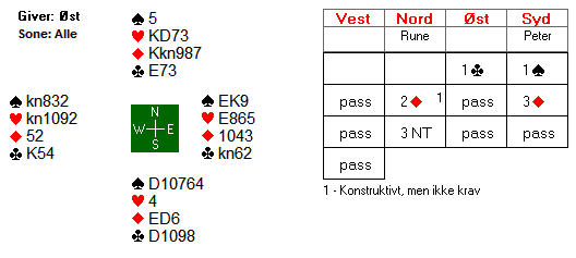 Fortsettelsen var kløver dame som vest dekket med kongen og Rune vant med esset. Da han så spilte ny kløver gikk øst i tenkeboksen. Til slutt valgte han å vinne stikket med knekten.