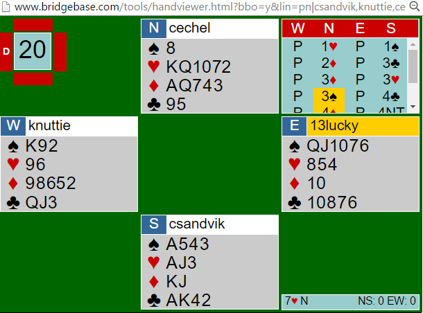 På grunn av at alle de uteværende honnørene i svartfargene sitter i nord er det mulig å vinne hele 13 stikk i hjerter. Men det er ikke bare bare å få meldt slem.