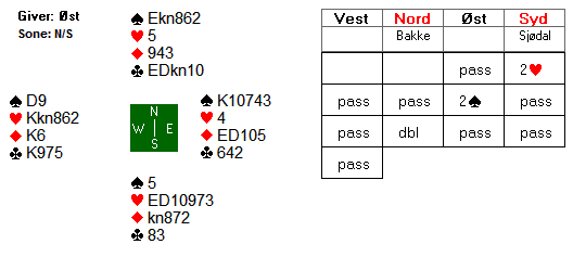 Det hele endte med to beit og 300 til Christian og Sofie. Denne scoren ga ikke mange poeng da en stor andel av parene hadde fått spille majorkontrakt i sonen øst-vest.