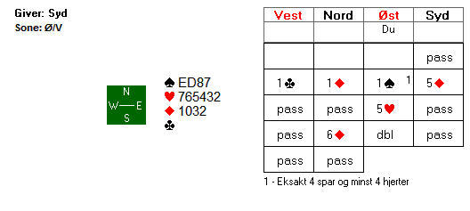 Oppgave 3: Hva tror du makker må ha for å melde 5 hjerter? Ville du som vest høynet til 6 hjerter?