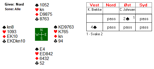 Christian Fredrik Johnsen (12) valgte å åpne med svake 2 spar. Makker Kaja Brekke (12) meldte deretter utgangen direkte. Hele spillet så slik ut: