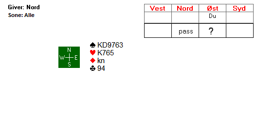 Selv er jeg ikke like kategorisk. Med solid 6-kortsfarge er det uproblematisk med 4-kortsfarge på si. Har man derimot en relativt tynn primærfarge mener jeg det er bedre å passe i første omgang.