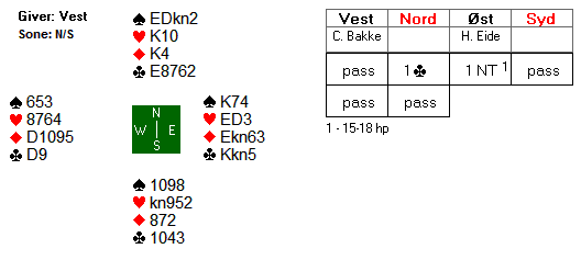Anne Lene åpnet med 1 N i 2. hånd, Tom overførte til hjerter og over svar 2 hj fra Nord hoppet han til 3 NT. Bare to par spilte kontrakt i hjerter, resten spilte 3 NT.