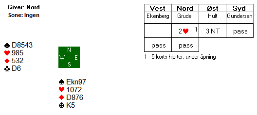 Med åpne kort står kontrakten selv uten ruter ut fordi øst blir skvist i spar og ruter. Hun må gå ned på singel spar konge for å holde ruteren gardert. I praksis spiller man vel heller på finessen i spar og går beit.