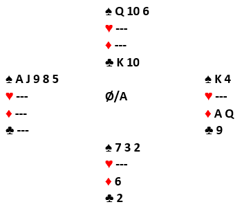 Muller vant med kløver ess andre gang og tok ruterstikkene. På den første fulgte jeg, og på den tredje ruteren la jeg kløver 10 fra 10-6 for å late som om jeg hadde igjen K-10. Så kom den siste ruteren, og nå måtte jo jeg (hvis det var slik at jeg hadde kløver konge) kaste en spar, kanskje fra damen tredje opprinnelig? De to sitsene Muller måtte velge mellom var med fem kort igjen: