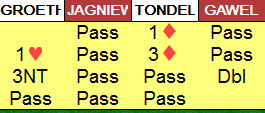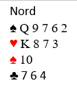 Vil du kravåpne i Øst eller nøyer du deg med 1 spar og tenker i neste runde å hoppe i hjerter? Flere fikk pass på 1 spar, Vest har bare 3 hp. Som man ser er det lett i vinne 4 hjerter med 12 stikk når kl K er i Syd. Bare ett par kom altså i 6 hjerter.