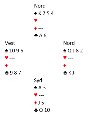 Syds hånd gir et valg i meldingene. Enten kan han åpne med 1 grand (men er litt for sterk til det), eller vise hånden som en 18-19 grand med åpning 1 i farge og et hopp i grand neste gang. Det er et tredje alternativ, åpning med 1 ruter fulgt av 2 hjerter som revers. Jeg liker best å vise hånden som grandhånd, og da oppvurdere den til 18-19 grand. Noen av de som valgte å reverse gjorde makkerene veldig ambisiøse, og det endte flere steder i 7 ruter. Lilleslem er bombesikker om ikke ruteren sitter 5-0, men i 7 ruter er det kun tolv toppstikk. Ser du hvilken elegant spilleføring dette kortmønsteret gir mulighet for? Det trettende stikket kan komme via en skvis i kløver og spar om samme motstander har både fem spar og kløver konge. Men siden det er trumfkontrakt er det en ekstra mulighet, en spar kan trumfes god om den med fire kaster spar (eller blir presset til å kaste spar). Etter trumf ut spilles tre runder ruter, så fire runder hjerter med kløveravkast fra nord. Da ser det slik ut: