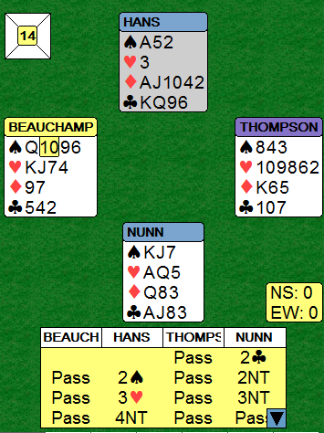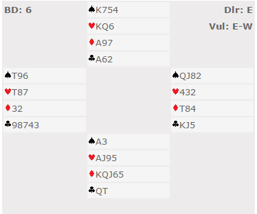Et av Australias beste par, Sartaj Hans-Tony Nunn (Sartaj er skribent i BIN) var på laget som tapte Trials-finalen. De fant ikke ut av det og stoppet svakt i 4 grand. Ved det andre bordet fant heller ikke N/S toppkontrakten 6 kløver, men Andrew Peake og Peter Gill meldte 6 ruter med førstnevnte (syd) som spillefører. Han fikk trumf ut fra vest og lot den seile til østs konge, og det kom mer trumf. Da var det elleve toppstikk. Kontrakten ser ut til å avhenge av å velge hvilken finesse som skal tas, spar eller hjerter. I ruterkontrakt kan en hjerter trumfes tidlig for å se om kongen sitter dobbel, så falle tilbake på sparfinesse. Alternativt kan det tas A-K i spar for å se om damen sitter dobbel, så prøve hjerterfinessen. Ingen av de variantene lykkes. Peake spilte imidlertid på en sjanse for skvis, og han kunne i så fall prøve hjerterfinesse som siste sjanse. Han tok en tredje runde trumf, så fire runder kløver. Deretter tok han de to siste ruterne, og idet den siste ble spilt så det slik ut: