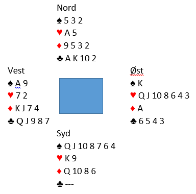 Kløver dame kom ut mot syds 4 spar. Det ga spillefører en sjanse selv om det unektelig ser ut som det er to tapere og ruter og trumf. Scwartz tok for A-K i kløver og kastet to ruter. Så stjal han en kløver fulgt a hjerter konge og hjerter til esset. Den fjerde kløveren ble stjålet hos syd, og da var dette igjen: