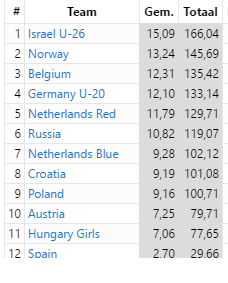 Her er de beste lagene i lagturneringen hvor 34 lag deltok: