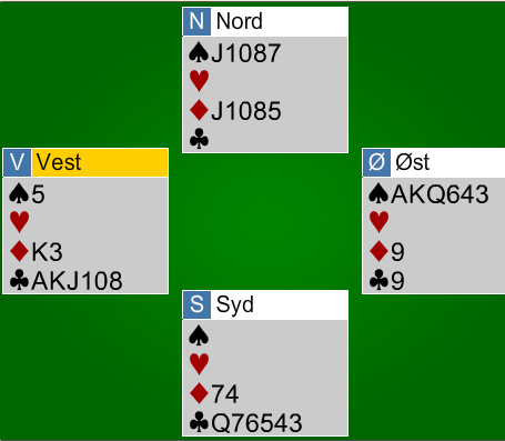 Idet det nå spilles kløver til finesse og A-K i kløver er nord i trøbbel. Han må holde fire spar, og det blir kun plass til en ruter hos han. Men hvis syd ikke allerede har kastet en ruter har han ruterhold med syveren tredje opprinnelig! Men så kommer A-K-Q i spar. Alle skal ned på kun to kort, og syd sitter med kløver dame og 7-4 i ruter. Vest har kløver knekt og K-3 i ruter, og nord har singel ruter på dette tidspunktet, for han måtte jo holde sparen. Hvis syd kaster kløver dame på den tredje sparhonnøren forsvinner ruter 3 fra vest, og hans to siste kort står. Hvis syd kaster en ruter forsvinner kløver knekt, og vest tar de to siste med ruter konge og ruter 3!