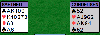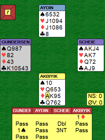 Anders Gundersen og Marcus Scheie endte i 3 grand i stedet for 4 spar som også er en grei utgang. Syd spilte ut ruter ess og skiftet til hjerter til nieren og kongen. Scheie tok et par sparrunder før han spilte kløver til knekten som var safe, ruter dame gardert. Dermed hadde han ti enkle stikk, +630.