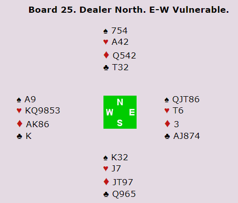 Englands øst åpnet med en 1-melding og viste etterpå 18-19, en avgjørelse som kan støttes med denne gode 17-poengeren. Det er selvsagt litt tilfeldig hva som blir riktig i slike tilfeller, men her ga det gevinst å være optimistisk med østs hånd som i følge Kaplan Rubens handevaluator er verd 18,2 hp. Slik så hele spillet ut: