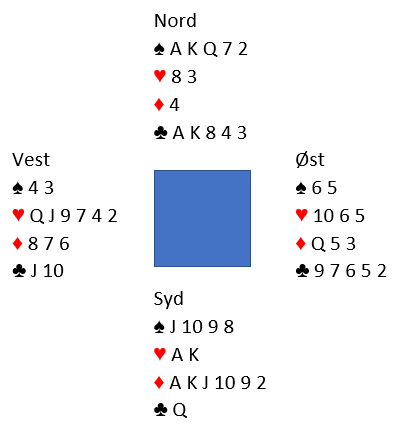 Den norske øst åpnet med 1 grand som makkeren passet på, og da N/S kom innpå og var i 2 spar gikk det pass rundt.