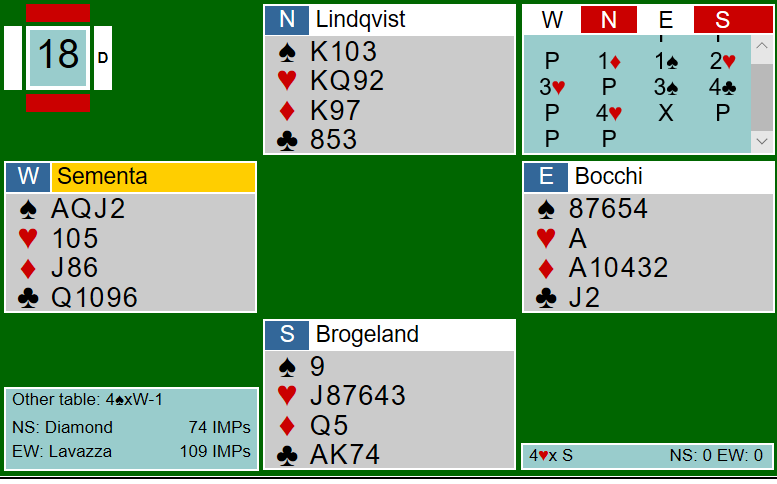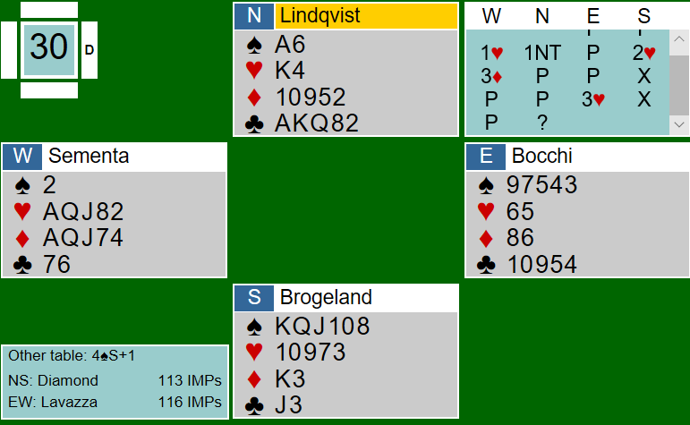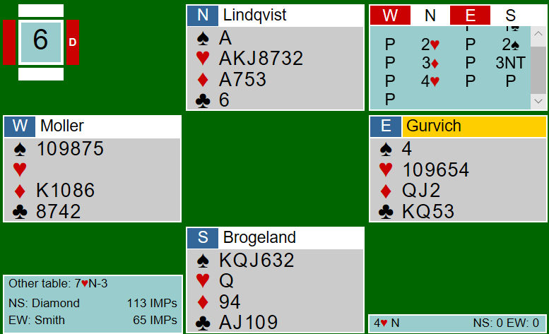 Ved det andre bordet spilte Grude-Øigarden motspill mot delkontrakt i ruter hvor det ble elleve stikk, 7 IMP inn.