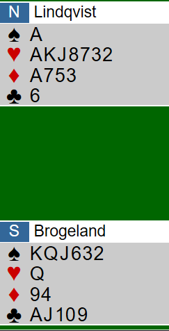 Et ganske typisk trekk i gårsdagens kamper var et det norske laget meldte hardere utganger enn motparten, og de fleste stod. La oss håpe det fortsetter i dag, både at de ikke blir for overmodige og at mange av de tøffe, brukbare utgangene fyker hjem. Her en utgang Haugstad-Helness meldte hvor de svenske motstanderne ved det andre bordet stoppet i delkontrakt. (Øst giver, ingen i sonen)
