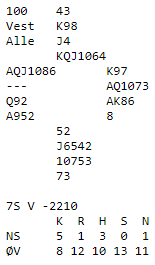 Idet Hult gikk på en gang til med 5 ruter så benektet han kløverkontroll, men sa også at han omtrent hadde resten dekket opp. Da åpneren slo av i 5 spar kunne ikke lenger slem stå, og Hult passet. Men slemforsøket kostet IMP da motstanderne stoppet i 4 spar, selv om det om du ser kun på N/S sine kort ser ut som 5 spar ofte vil stå. For slik det litt uheldig satt hentet Ø/V raskt en bet i 5 spar med kløver ut, A-K og kløver til stjeling.