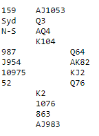 Ps. Ett enkelt spill beviser ingen ting, men øst sin aksjon er kanskje ikke så bra? I dette spillet var det ikke vellykket å doble i alle fall. Det er ganske mange eksperter som mener det ikke er noen god strategi å doble i andre hånd mot en sterk grand når man sitter med 15-16 balanserte. Enten bør det være en sterkere balansert hånd, eller 15+ med en bra farge. Vel, denne gangen førte doblingen til at Sveindal ble fristet til å melde den harde utgangen bl.a. fordi han var klar over makkeren vet hvor alle honnørene sitter, og akkurat det utnyttet Bakke. Uten doblingen fra øst er det langt i fra sikkert spillefører får så mange stikk i grandkontrakt. Nesten halvparten av N/S parene gikk bet i dette spillet, noen få gikk faktisk bet i 1 og 2 grand, og ganske mange en eller flere bet i 3 grand. De som feilet det meste (tre stykker) gikk fire sonebet i 3 grand!