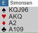 Jørn Johansen (Ø)- Egil Hansen (V) bruker svake grandåpninger utenfor faresonen og Jørn åpnet derfor med 1 grand. Det gikk så pass fra Olav Erik i Syd og Egil i Vest (12 poeng rekker ikke til utgang!) men Tommy kunne doble med styrke som åpner. To ganger pass og Egil dro som rimelig er fram et rødt doblingskort. Ser leserne noe håp for spillefører som bare har 3 poeng men relativt god fordeling?