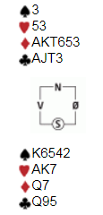 Forquet fortsatte med en tredje runde spar. Øst kunne ta tre sparstikk (syd kastet to kløver), men så måtte han spille hjerter, ruter eller kløver.
