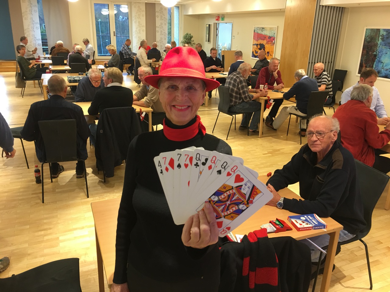 I en gjestevisit tok Turid og Svein hjem seieren selv med en dårlig sisterunde. Ludvig og Olav hadde satt seg feil vei og hadde en god pluss da resultate ble regnet ut. De ble utropt som vinnere, men plusspoengene skulle Leif og Roar ha. Olav kunne (burde) spilt hjem 3 spar doblet, men gikk for sikkerhets skyld to beit. Turneringen var Simultan, så på landsbasis kom alle store spill Ludvig tilgode, så det ble en hederlig 16. plass på 62%.