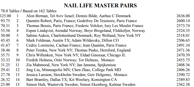 Boye Brogeland og Espen Lindqvist kom til slutt på 4.plass i NAIL LIFE MASTER PAIRS under det amerikanske høstmesterskapet (Fall Nationals) i San Diego.