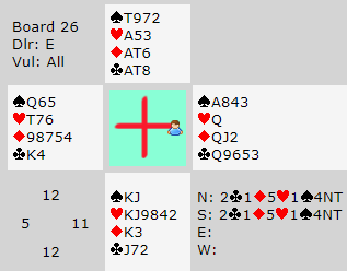 Madammen på vests plass spurte meg om hvordan hun skulle ha meldt storeslem. Jeg kunne berolige henne og si at "du skal være fornøyd med å melde lilleslem i sånne spill". Og ganske riktig, å notere +1390 ga 77% til Ø/V.