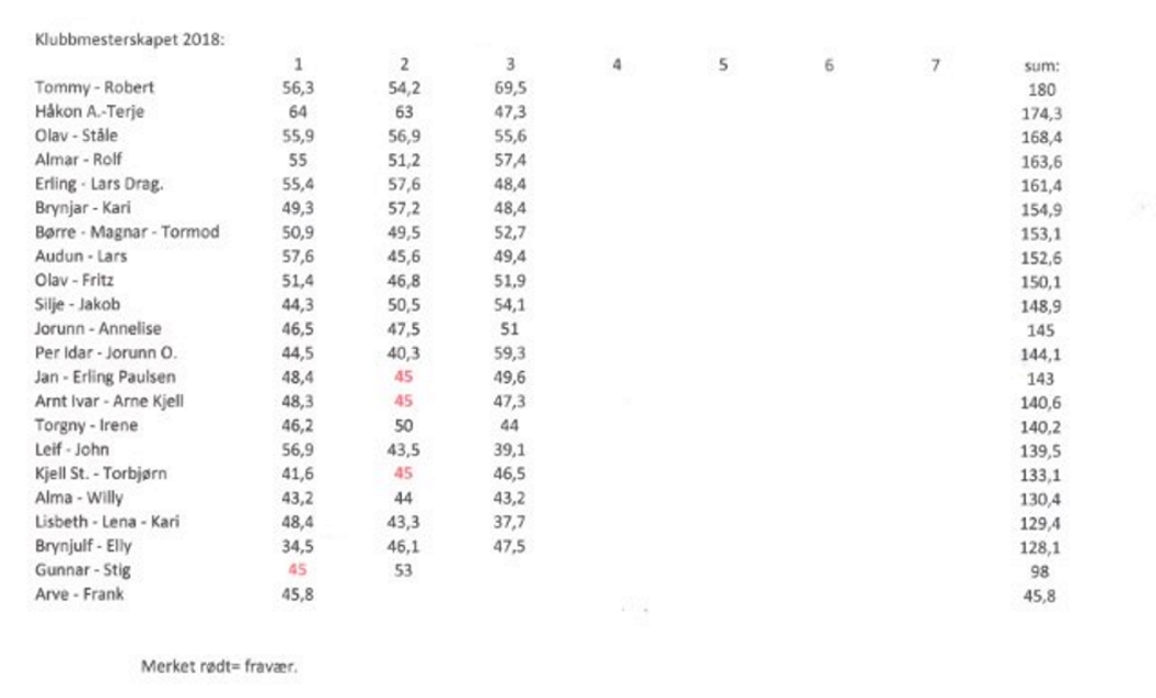 Da kvelden var over og resultatene i boks sto Steinar og Frank frem som suverene vinnere av klubbmesterskapet hvor resultatene fra 6tte og siste kveld viste seg å bli avgjørende. På de neste plassene fulgte Roald og Rolf L på andre og Jan og Kjell på tredje. Gratulerer!