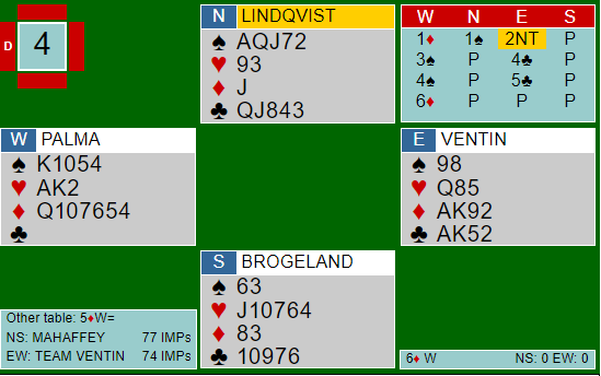 I åpent rom åpnet Zimmermann med 1 kløver, Multon svarte 2 ruter (sterk!) og Syd gjenmeldte 2 NT og over 3 ruter også 3 NT. Sleminvitt 4 ruter ga cuebid 4 hjerter og 4 spar men da Pierre etter det meldte 5 ruter hadde Franck mer å bidra med. Kl 5 ut som løp til damen for 12 stikk og +420. Men det ble bare småtterier for slik gikk det i lukket rom: