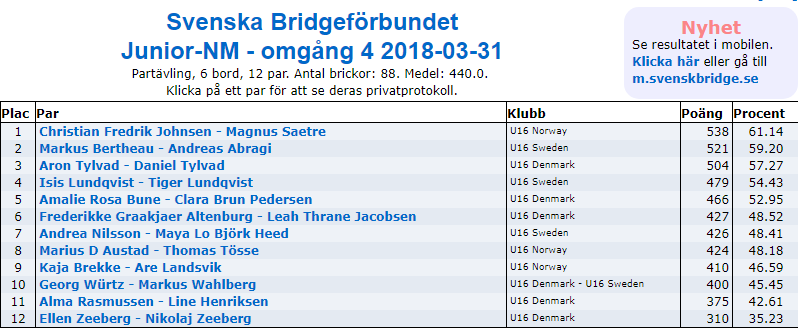 Resultater tredje sesjon (lørdag 09.30 - 12.30 - oppdateres etter hver runde)