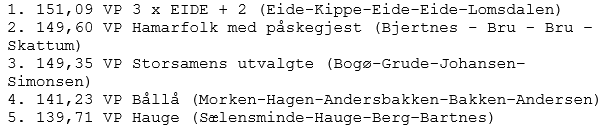 Det var jevnt før den siste runden, og laget med 3 x Eide (Harald, Erik og Lars) samt Håkon Kippe og Olav Lomsdalen snappet 1.plassen med den største seieren i siste kamp, av de som la an til å kunne vinne med en runde igjen å spille.