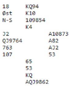 Å melde 5 kløver med renons var unekltelig litt spesielt, men det så jo aktuelt ut inntil videre. Øst var presset opp i 5 hjerter doblet, og N/S lå an til et godt spill.