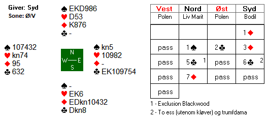 I lukket rom passet Heskje i 1. hånd, men da åpnet jo Rimstedt i Nord med 1 ruter* og Grønkvist i Syd svarte 1 hjerter. NÅ kom Vest innpå med 1 spar og Nord støttet makker med 2 hjerter- bud. Syd kom så på hugget, 4 kløver (splinter) og cue 4 ruter samt 4 spar fulgte. På 4 NT (5-ess) fra Nord kom svaret 5 ruter(0/3) og Nord kunne melde 6 hjerter. Bare få par var i lilleslem, de har jo bare 26 poeng men gode fordelinger.Med begge honørene i spar på rygg måtte jo ruterfargen oppføre seg skikkelig. Og det gjorde den, 3-2 imot og lilleslem sto som «høggen ved»! Spillet kostet 12 imp og snudde til svensk seier 27-40. Dermed tok Sverige føringen med Norge på flott 3. plass fortsatt. Tvi-tvi siste tre spilledagene for alle våre! De 8 beste i hver klasse er kvalet for VM senere i år.