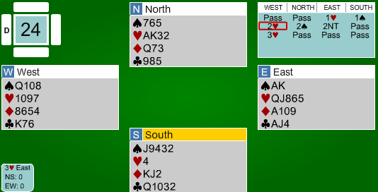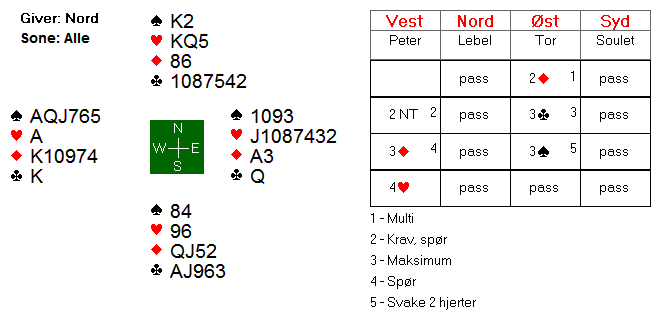 3 spar over 2NT burde kanskje vise en sterk hånd med spar, men det viste noe annet etter systemet, og derfor måtte Peter velge majorutgang uten å vite om makker hadde noe tilpasning i spar. Mot en maksimum, tok han sjansen på at 4 hjerter kunne være en vel så god kontrakt som 4 spar.