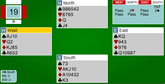 Din makker har åpnet med 2 ruter multi, og nå ser det ganske naturlig ut å fortsette med 2NT for å høre hva makker har, selv om du har en anelse om at makker har hjerter.