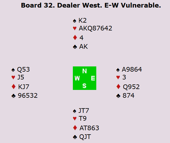 Slik var det ikke denne gangen, da det var 2 hjertertapere i 4 hjerter, i tillegg til en spar og en kløver, mens det var 11 stikk i spar. Dermed ble det 13 IMP til Frankrike.