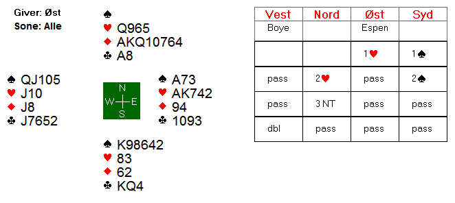 Espen spilte ut hjerter ess, der vest la knekten, og skiftet til liten spar. Går nord opp på kongen, kan han ta 11 stikk og 14 IMP til Hellas, men siden Boye doblet 3NT, var han sikker på at spar ess satt bak. Han la derfor liten spar og Boye vant stikket med 10'eren.